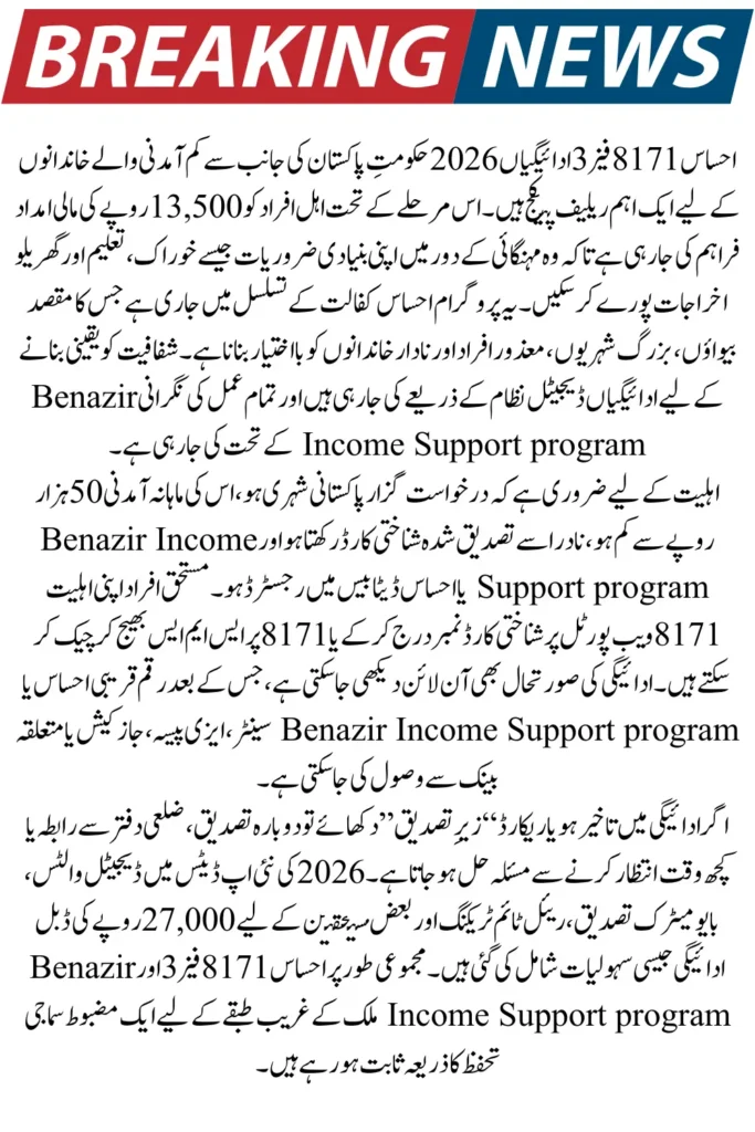 The Government of Pakistan has officially launched the Ehsaas 8171 Phase 3 Payments 2026, bringing relief to thousands of low-income families across the country. Under this phase, eligible beneficiaries will receive Rs. 13,500 in financial support to help them manage essential household expenses, food, and education needs.