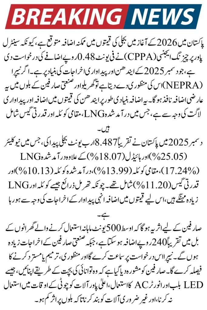 Electricity prices in Pakistan are expect to rise again in early 2026, as the Central Power Purchasing Agency (CPPA) has requested an increase of Rs 0.48 per unit under the monthly fuel price adjustment mechanism. This adjustment is intend to reflect changes in fuel costs and generation expenses for December 2025. If approved by the National Electric Power Regulatory Authority (NEPRA), the increase will affect household and industrial electricity bills for one month.