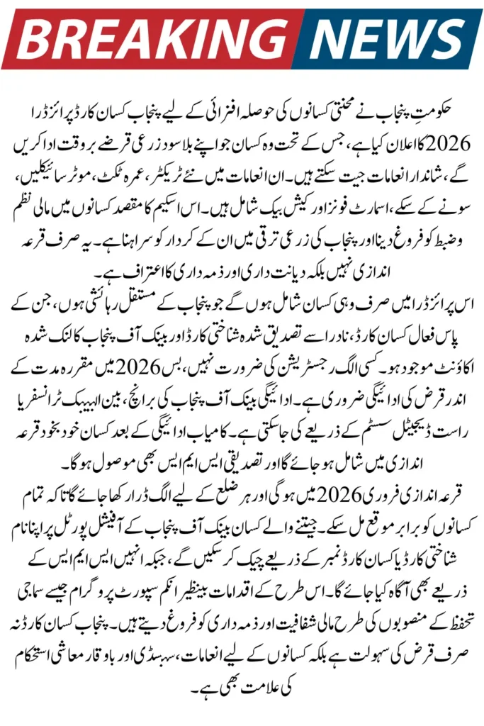 The Punjab Kisan Card Prize Draw 2026 is a groundbreaking initiative launched by the Government of Punjab to reward hardworking farmers who repay their interest-free agricultural loans on time. Through this program, farmers can win exciting prizes such as brand-new tractors, Umrah tickets, motorcycles, gold coins, smartphones, and cashback rewards.