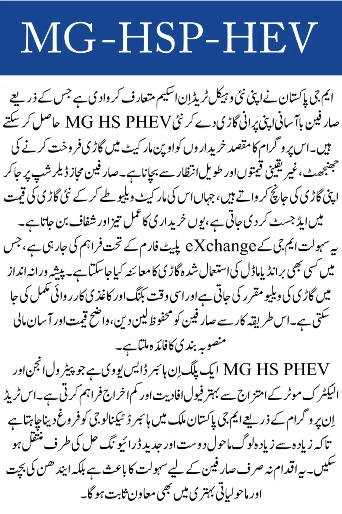 In conclusion, the MG Pakistan Vehicle Trade-In Program provides a convenient and transparent pathway for customers who want to upgrade to the MG HS PHEV. By reducing the complications of selling a used vehicle, MG Pakistan is supporting a smoother shift toward hybrid mobility and modern driving solutions in the country.
